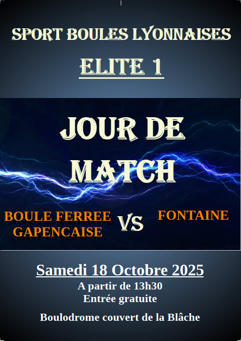 Samedi 18 octobre à 13h30 l'équipe élite 1 de Gap reçoit la redoutable équipe de Fontaine. L'entrée est gratuite. Venez les soutenir, en les encourageant pour leur courage , leurs déterminations. Ils se battront pour leur club, la BFG. Ils ne seront jamais ridicules car ils aiment ce qu'ils font. Ils vivent une aventure extraordinaire et par ces rencontres à venir, cette rencontre , ils préparent la saison prochaine. la BFG croit en eux car ils sont solidaires. C'est une véritable équipe de Sport Boule, de Lyonnaise. Ils honorent le club et préparent l'image à donner à notre future école de boules. N'hésitez pas à vous renseigner au club pour les inscriptions à venir avec notre équipe d'animateurs , de formateurs, de ce formidable sport. Vive la BFG. Pascal Beghin