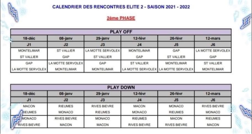 Calendrier des matchs "PLAY OFF" BFG ELITE 2